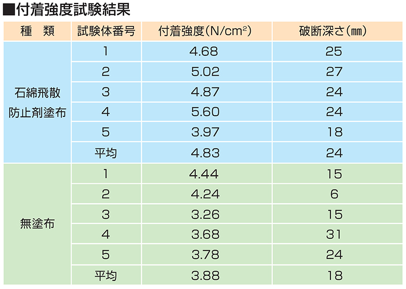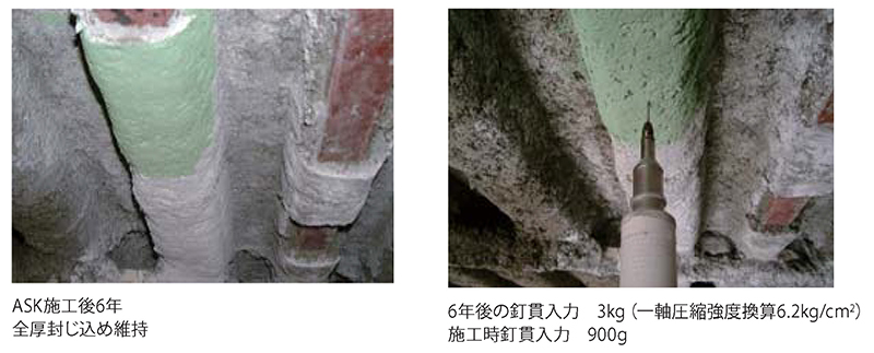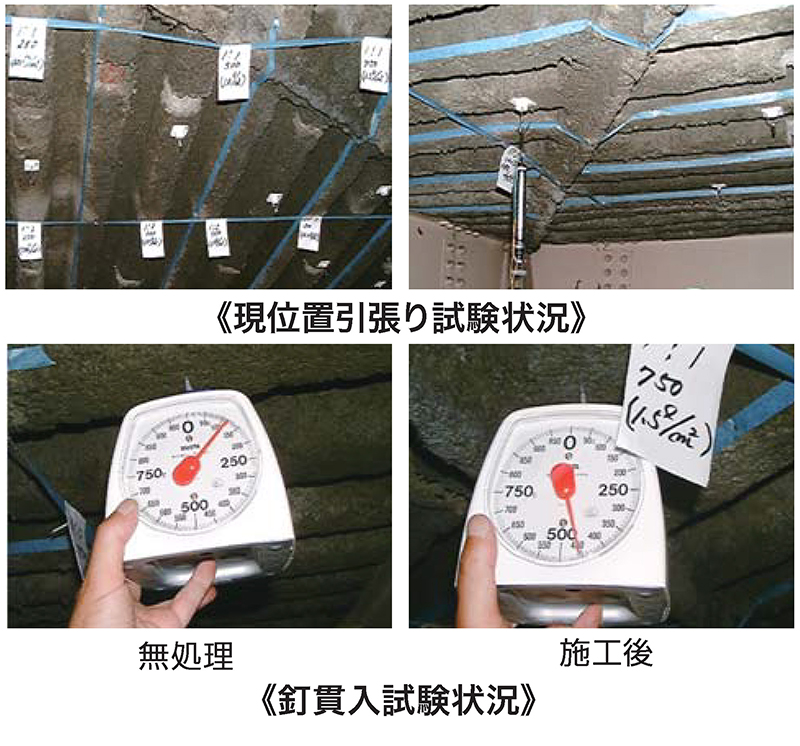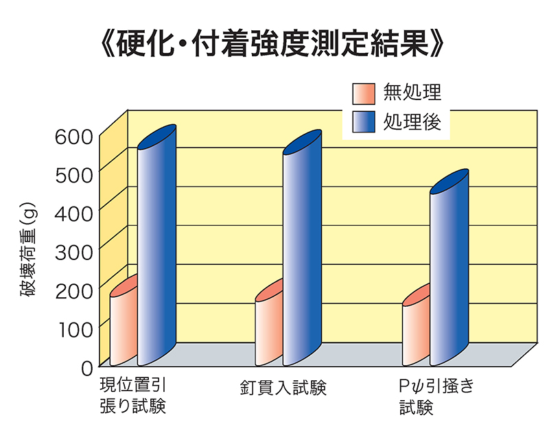 現位置引張り試験に於いては、原材の強度が平均でτ=12g/cm2であったのに対し、施工後は平均強度τ=34g/cm2に向上できた。