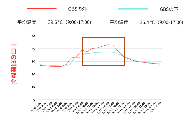 グランドビッグシェード設置により日中の温度上昇が抑えられていることが分かります。